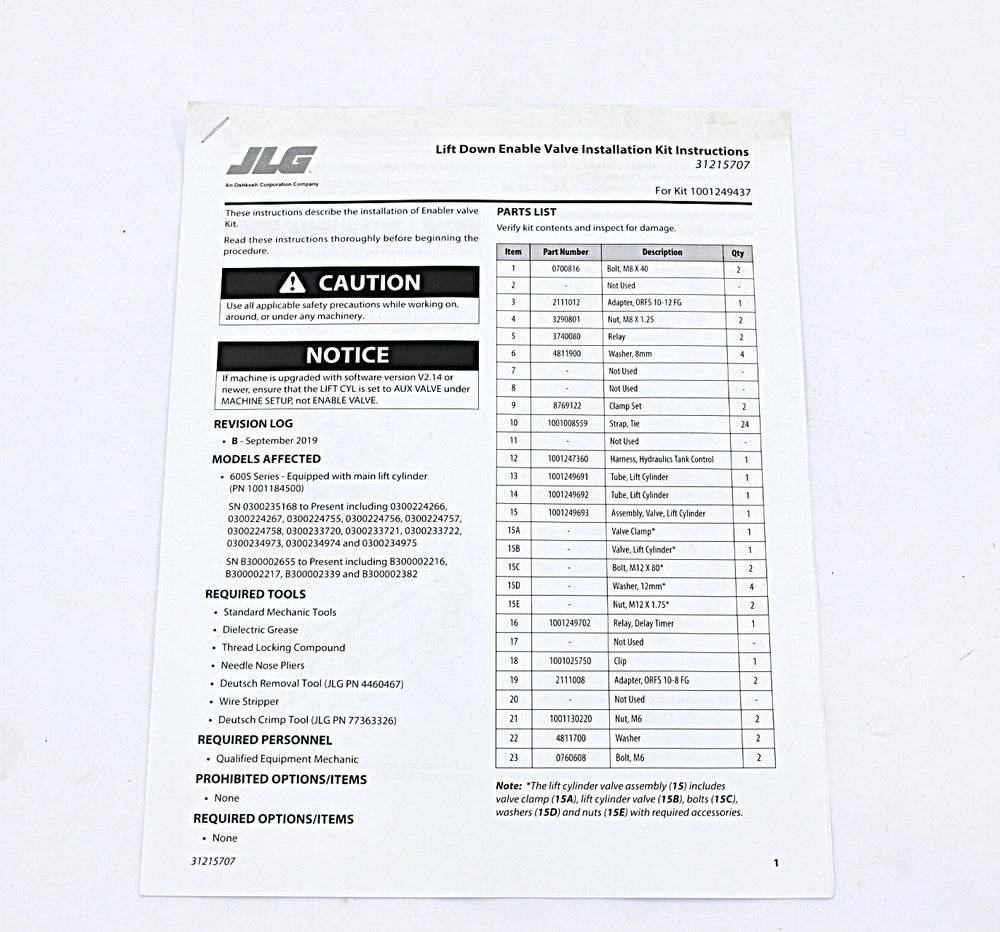 JLG - 31215707 - KIT-INSTRUCT - ENABLE VALVE